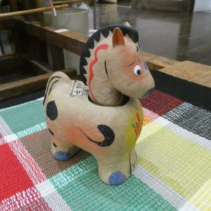 写真は民芸に深く興味を持たれた故菅野暎子先生のコレクションから、今年の干支にちなんで馬をご覧下さい。匠工房は民具のコレクションでいっぱいです。ご来館の折りには、地機ばかりでなく、柱や天井に飾ってあるものもご注目下さい。ご説明も致します。